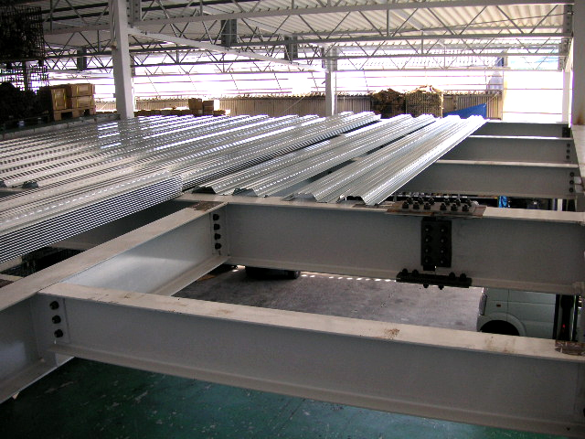 鉄骨の骨組み終了後デッキ材を乗せる。